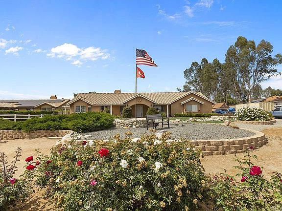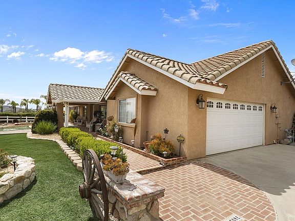 This Single Story Ranch Style Home offers a wonderful entertaining back yard with a built in Pool & Spa, Gas BBQ Island w/refrigerator, Fireplace with seating area. Exterior has been pre-wired for lightening. Water systems throughout the property. Walk across an adorable bridge to the Orchard with Fruit trees of Orange, Apple, Lemon, Lime, Grapefruit, all grown with organic compost. Drought resistance landscaping. Room for RV Parking, two large 8x12 storage units. Interior offers 4 total bedrooms and 3 bathrooms. In addition to the master suite, one other bedroom has its own private bathroom with walk-through tub. Kitchen has upgraded stainless farm sink, granite counters in. 2 car garage offers additional storage space and built in cabinets. Horses are allowed in this area, home is located in the Woodcrest area of Riverside County with most properties on large parcels. Wonderful country atmosphere and is quite location with no traffic noise. Front landscape is also drought tolerant, there are existing sprinklers under the turf.