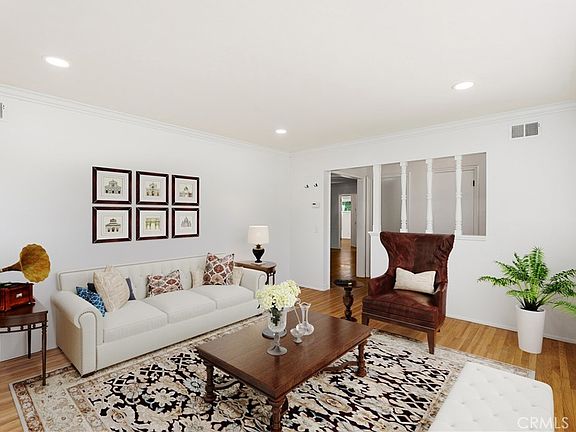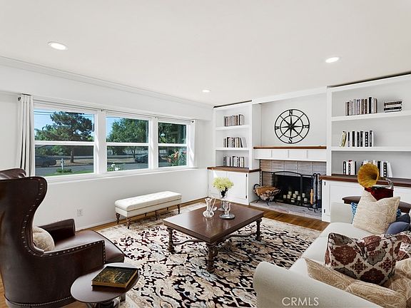 Nestled on a peaceful cul-de-sac in North Tustin is this charming single-level 3 bedroom, 2 bathroom home situated on a spacious quarter-acre lot. Boasting 1,595 square feet of living space, it effortlessly blends timeless charm with modern comfort. As you step inside, you'll be greeted by the warmth of white oak hardwood floors that flow gracefully throughout the living spaces. The interior exudes a fresh and inviting ambiance, with the formal living room right off the entry featuring crown molding, a walnut mantle over the fireplace and stylish built ins. The wonderful kitchen has been modernized with Quartz countertops, freshly painted cabinets, and new appliances. The spacious family room is off the kitchen with ample space for a dining area and offers a large slider that leads you to the retro bonus room with stacked-brick accents and wood beams. This could be used as a game room, art studio, office, or an indoor gym. Down the hallway, you will find the spacious primary suite and the generously sized secondary bedrooms along with a hallway bathroom with a walk-in shower. Step into the light and bright primary bedroom with two wall-in closets and an ensuite bathroom with a shower in tub combination. That backyard is truly your own private oasis that is sure to be the hub of many fond memories made over the years with friends and family. With the terraced vegetable garden on the side of the home, various fruit trees and the recently built chicken coop you are promised farm-fresh delights year-round. The side of the house has been grated providing ample space that could be used for RV parking or other recreational vehicles. The attached 2-car garage has been updated with a loft for additional storage. Walk 100 feet from the property to find yourself on the famous Tustin Branch Trail where locals can walk their dog safely and take in the tranquil beauty. This home is just minutes away from Old Town Tustin and North Tustin shopping, restaurants, parks, easy access to the 55, 22 and 5 freeways.
