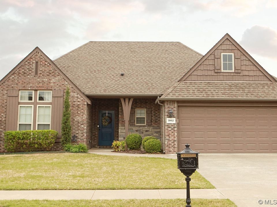 Gorgeous move-in ready full brick home. Wonderful great room w/a vaulted wood beamed ceiling, stone FP and stunning hardwoods that open to the Chef's kitchen. Granite counters, stainless appl. & a walk-in pantry. The lovely dining room overlooks the backyard. Wonderful Primary bedroom w/great natural light, a vaulted ceiling & an En-Suite bath featuring a stand-alone tub, separate shower, double sinks, granite counters & a very spacious walk-in closet. 2nd bedroom also features a walk-in closet. Seller has removed carpet in all bedrooms & added rich hardwood flooring (even in the closets). Laundry room located off the Oversized 2 car garage w/a built-in storm shelter. Backyard has a full wood privacy fence & a covered patio to dine al fresco or entertain. More updates include freshly painted interior throughout, new landscaping & a new sprinkler system. Walking trails lead to ponds, a community pool & a clubhouse. Very well maintained & beautifully decorated home w/designer colors throughout.