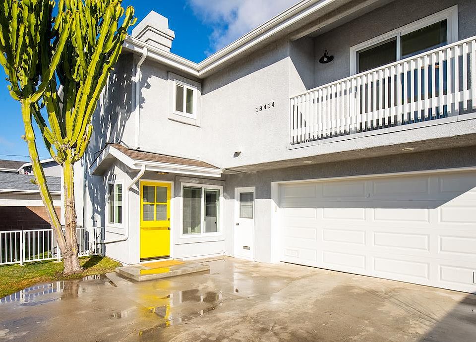 Completely updated modern school house style home tucked away in the heart of North Torrance. Enter into this remodeled and private 3BD + 2BA unit through a zesty lemon yellow Dutch door outfitted with a library-style checkout shelf. This standalone back unit of a duplex features two levels. On the first floor is a private suite: living area with a vintage painted "disco rock" gas-log fireplace, full bath and a generously sized bedroom. Upstairs welcomes you to a light-flooded living room with another vintage painted "disco rock" gas-log fireplace, massive skylight, kitchen with stainless steel appliances and an eat-in center island. Upstairs there are two more spacious bedrooms (one of which has a balcony), a full bathroom, and a side-by-side laundry closet with a newer washer/dryer. The bathrooms are outfitted with penny tiles, vintage lights, and tumbled brass hardware exuding a schoolhouse vibe. A grassy backyard is perfect for lounging or for summer BBQs. Additional features include sessil oak wood style floors, copper-lined light fixtures, an oversized private two-car side-by-side garage, dual zone central HVAC, and two additional storage closets. Conveniently located near the Del Amo Mall, LAX, SpaceX, Redondo Beach Pier, Shopping, Eateries, Starbucks, the Forum, SOFI stadium, and the new Clippers stadium. School is in session!