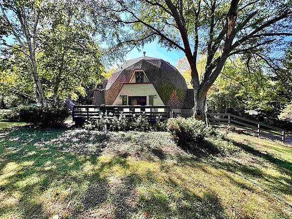 Nestled in the perfect setting - tree lined, secluded with meadow around this beautiful GeoDome home on 4.8 acres. Home has an open floor plan and wonderful flow with multiple areas for living and dining, a wet bar, 4 spacious bedrooms, 4 baths and a large well appointed all electric kitchen with walk-in pantry. Additionally, there is a full basement with one of the bathrooms, currently partially finished, but could add additional living space or accommodate a terrific workshop. Home has a screened sun porch and a deck for barbecuing and lounging. Exterior of the home and deck have been repainted and look spectacular. The 33' x 36' shed in the rear has a dirt floor and could easily accommodate 2 or 3 stalls for horses or other animals and, the land near the home and shed, is suitable for pastures or simply a safe area for the children to play. Close to shopping, services and Metro in Harvard. A must see!