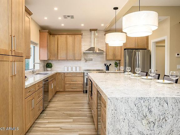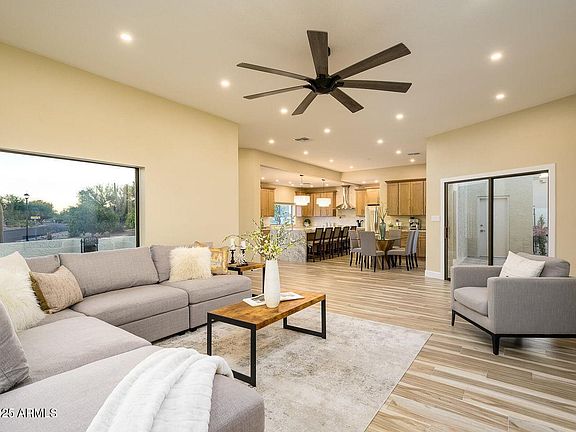 Nestled in a peaceful cul-de-sac within the sought-after Rio Verde community, this completely renovated 3-bedroom, 2.5-bath concrete block home offers the ultimate luxury Arizona living. Designed with both comfort and sophistication in mind, every detail showcases meticulous craftsmanship and modern finishes. Step into the heart of the home - a chef's kitchen featuring a large granite island with waterfall edges, custom wood cabinetry, abundant storage, and all-new stainless-steel appliances, ideal for entertaining or everyday living. Unwind in the spacious primary suite, where a fireplace adds warmth and ambiance. The ensuite bathroom boasts a Carrara marble dual vanity, custom tiled shower, separate soaking tub, and a generous walk-in closet. A bonus room just off the suite provides flexible space for a home office, reading nook, or gym. Throughout the home, tile floors, natural light, and an open layout create a seamless blend of style and functionality. Smart home features including smart thermostats, video doorbell, and dawn-to-dusk exterior lighting offer modern convenience at your fingertips. European-style motorized shutters provide added shade and security, elevating both comfort and peace of mind.