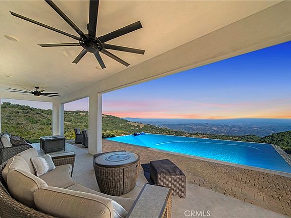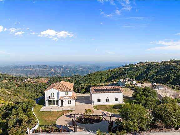 Beautiful MODERN Design, ABSOLUTELY STUNNING VIEWS, this exquisite property at 18419 Cerro Road offers a luxurious and serene lifestyle. This Tenaja residence boasts a modern 2-story design encompassing 4 bedrooms and 4 1/2 bathrooms, with an impressive 3,900 square feet of living space. Main floor bedroom and bathroom with huge walk-in closet. One of the standout features of this property is its generous 4.59-acre lot, providing both space and privacy in a serene natural setting. Expansive 6 car garage that has vaulted ceilings as high as the two story house, constructed in 2022, has ample storage for car enthusiasts or those seeking a spacious workshop. This home is a masterpiece of contemporary architecture, with large windows and open spaces that invite natural light and offer breathtaking panoramic views that stretch all the way to the ocean. Enjoy spectacular sunset views from the comfort of your own home. Magical zen living above the clouds. Fully paid-off solar system ensures energy efficiency and cost savings. Well and city water supply so you will have a huge savings on the water bill should you desire to grow your own vegetation. The absence of HOA fees adds to the appeal, allowing you to enjoy the benefits of a beautiful community without additional monthly expenses. Whether you’re seeking a luxurious family home or a private retreat with stunning vistas, 18419 Cerro Road offers the perfect blend of modern design, spaciousness, and natural beauty, making it a remarkable opportunity in the highly desirable community of Tenaja in Murrieta, California.