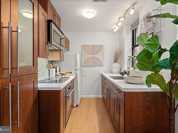 Unit #20B at The Crescent is a top-level, one-bedroom, one-bathroom home that effortlessly blends the original charm of the neighborhood with thoughtful updated designs and functionality. Just off the front door you arrive in the foyer entrance with a hallway on the left holding the in-unit washer and dryer, closet space, and a spacious bathroom with a large vanity and tub shower. As you walk further into the unit you arrive in the sun-drenched living room with gleaming bamboo hardwood floors, recessed lighting, a designated dining area, and three large windows flooding the home with natural light. To the left is the open-concept, gourmet kitchen fully equipped with custom cabinetry, stainless steel appliances, a custom tile backsplash, a pantry, and ample counter space for all your cooking needs. To the right of the living room is the spacious bedroom with charming built-ins, a wardrobe, and a private balcony. You can have it all with this unit where everything has been thought of. Don’t miss your chance to call this beautiful home in a wonderful neighborhood your new home. Super low fee, pets allowed!