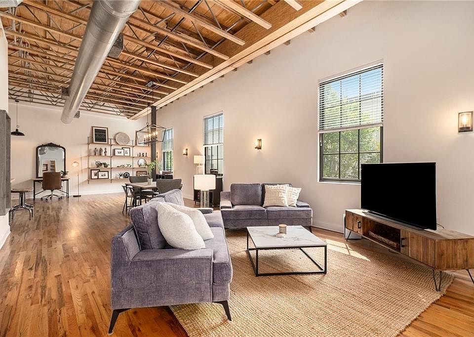 Top floor, end unit loft in walkable to downtown Roswell's hot Canton Street district! Lots of natural light from several windows and glass door. Gorgeous loft with tall ceilings, exposed beams, hardwoods and luxury upgrades. True bedroom with full walls and a door for privacy. Awesome eat in kitchen in open floor plan. Large patio overlooking courtyard. Historic charm in this 1950 Roswell High School Gymnasium. Amenities include pool, tennis, gym, etc. Location! Location! Location! .2 miles to Pure, .5 miles to all the great restaurants, shops and energy that is Canton Street! Right around the corner from the amazing new Southern Post development that will revitalize an already thriving area. The future is bright! Easy access to GA400, Alpharetta Hwy and Roswell Rd to Cobb County make for a better commute. HVAC replaced 3 years ago. Refrigerator, washer and dryer stay. HOA recently renovated including exterior paint, hall way carpet, light fixtures etc. Incredible value for Downtown Roswell!