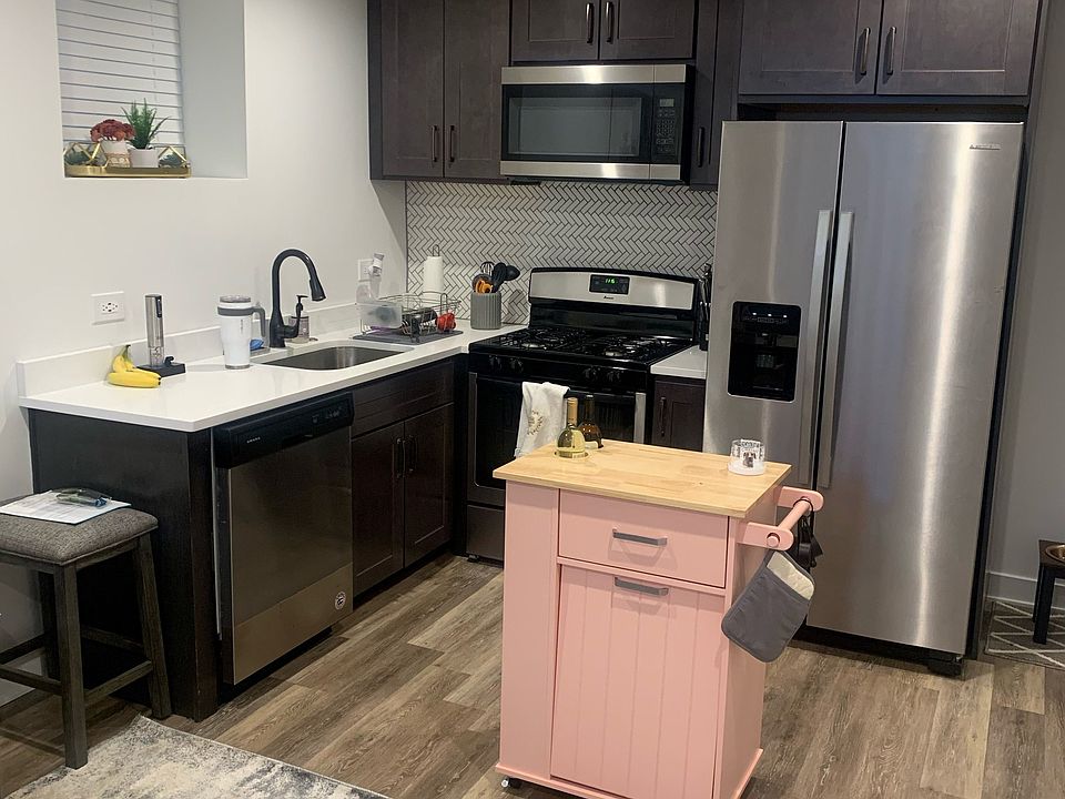 Complete gut rehab 2 bed/1bath located in fantastic area of Bucktown neighborhood! A short walking distance to the 606 trail and CTA Blue line (Western). Everything from floor to ceiling is brand new. Apartment features in-unit washer & dryer, forced heat and central A/C, hardwood floors throughout with lots of natural sunlight. Kitchen features stainless steel appliances, quartz counter-tops with eat-in kitchen island & pantry closet. Plenty of storage. Rent includes water and trash. Tenant pays electricity and gas. parking available on site for additional per month. pets welcome. Available NOW!