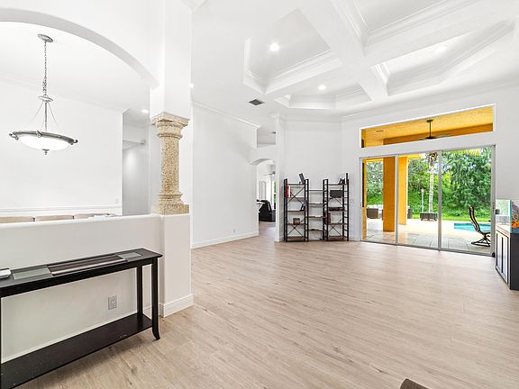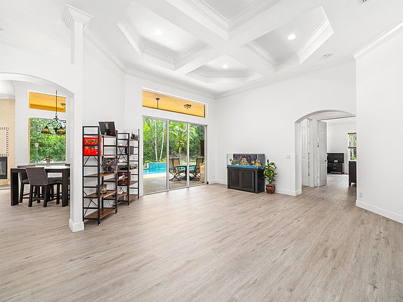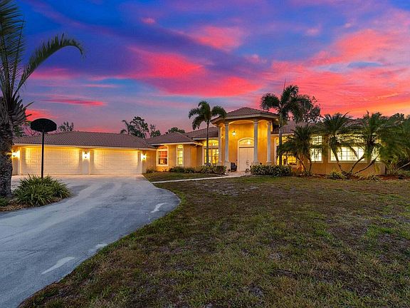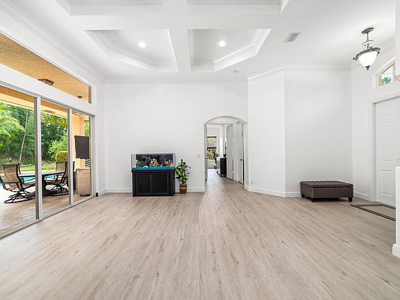 Privacy, space and comfort - you will have it all in this beautiful 1-story, 4 bedroom plus den, 4 bathroom, 4-car garage, CBS built home with a refreshing saltwater pool. It rests on the private, fully fenced one acre lot with in-ground irrigation system, no posterior neighbor and NO HOA, in the coveted Jupiter Farms area. Enjoy gorgeous BRAND NEW luxury vinyl flooring throughout (July 2023). The interior has been freshly painted (July 2023). There are incredible volume 16' and 14' ceilings, elegant tray and coffered ceilings, recessed lights, crown moldings, plantation shutters, chair railing in the dining room and wood burning fireplace in the family room. The oversized kitchen is equipped with black stainless steel refrigerator and dishwasher, granite countertops, raised cabinets topped with moldings, a center island, breakfast area, wet bar and a pantry. The spacious primary suite overlooks the pool and offers access to the patio. It features generous his-and-hers walk-in closets and adjacent nursery / sitting area. The en-suite primary bathroom offers split sinks, a tub and separate dual shower. Two guest bedrooms have walk-in closets and en-suite bathrooms. Step out and enjoy a quiet oasis on the covered patio with a safety fenced saltwater pool with variable speed pool pump and fountain. There is a laundry room with a sink and full size washer and dryer. The house is equipped with the water system, 2022 AC compressor and 2019 water heater. Take a ride to the lively downtown Abacoa with many great restaurants and shops, and Roger Dean Stadium. It is conveniently located to grocery stores, shopping plazas, and a newly developed Alton plaza. It is just 15-20 minutes away from the beach and Jupiter Carlin Park. Whether you want to spend a day at the Busch Wildlife Sanctuary, or an evening in the popular Harborside featuring fantastic waterfront restaurants, boutique shops, live entertainment, or go to a movie theater, it won't take you long to get there. All measurements are approximate. Take a look at the 3D virtual walkthrough.