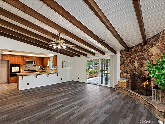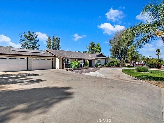 This charming single-story home located in a desirable neighborhood of Woodcrest offers a perfect blend of comfort and functionality, ideal for those seeking spacious living and ample amenities. As you enter, you will notice this home features an inviting open floorplan that enhances the sense of space and connectivity. Newer windows flood the home with natural light. The family room offers beamed ceilings and a large fireplace, with views of the kitchen. The kitchen is equipped with a double oven, 5 burner stove, granite countertops, a large breakfast bar, and dimmable recessed lighting. Modern updates include newer bathrooms, newer paint and flooring throughout. The primary bedroom offers a spacious walk-in closet, while additional bedrooms feature ceiling fans for comfort. Enjoy the convenience of leased solar panels, ensuring energy efficiency year-round.