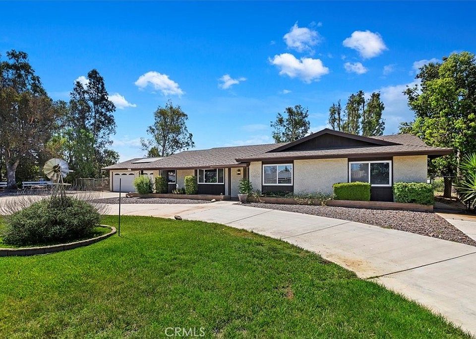 The exterior includes a large building for RV storage, and a 2-story structure equipped with electricity, water, and AC, providing endless possibilities for use as a future workshop, studio, or additional living space as an ADU "barndominium". For equestrian enthusiasts there is a barn with a tac room and 3 stalls , alongside a practical shed for storage. You will also find a covered patio and fruit trees (lemon, lime and avocado), perfect for outdoor gatherings. Property is fully fenced and cross fenced for added convenience. The 3-car garage has plenty of storage space and access to the rear yard. This home is close to shopping, parks, and schools. Don't miss the opportunity to own this versatile home combining rural tranquility with modern comforts and NO HOA. Schedule your tour today and envision the possibilities!