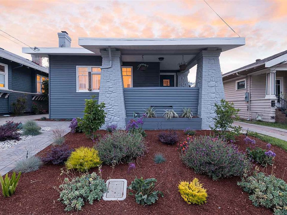 Beautifully maintained and updated 1919 California Craftsman-style Bungalow in Central Alameda with amazing yard. Just TWO blocks to Park amenities! A spacious front porch leads you to the sunny living room with cozy stone fireplace, built-in bookcase, banquet seating and inlaid wood flooring. The formal dining room boasts a boxed wood beam ceiling, bay windows and built-in buffet. The dining room opens to the smartly updated kitchen with blue wood lower cabinets, topped with marble and wood counters, white upper cabinetry, tiled surround and brass fixtures and handles. Off the kitchen is the laundry room, with plenty of cabinetry and a glass French door to the backyard. One bedroom and updated hall bathroom is on the first level. Two additional bedrooms are on the second level. A lower level bonus room/office with outside entry would be a great office. In the backyard is a sunny deck and lush green lawn. The detached 2 car garage makes a great hangout. Open SAT & SUN