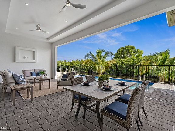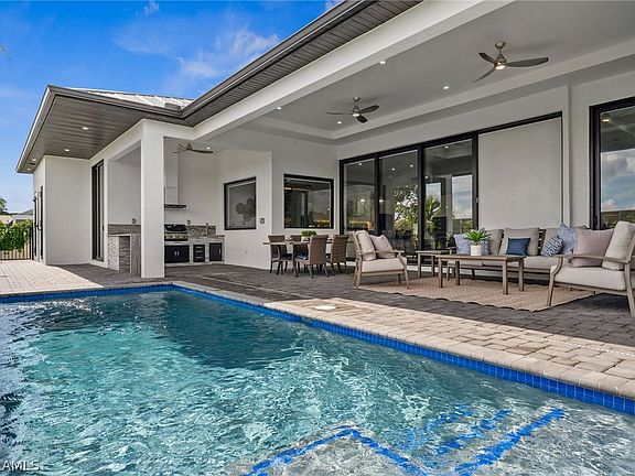This is an amazing indoor-outdoor entertaining house with a climate-controlled, glass-walled wine room and an oversized island. The border to the outside disappears through a wall of hurricane-impact pocket sliding doors. On the covered lanai, there is an outdoor kitchen equipped with a built-in grill, exhaust vent, sink, and bar, all overlooking the heated saltwater pool and direct Gulf access canal.