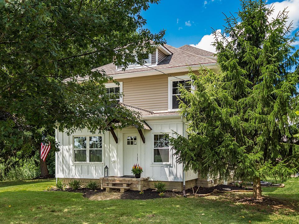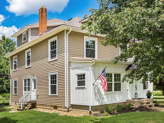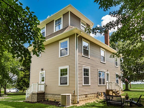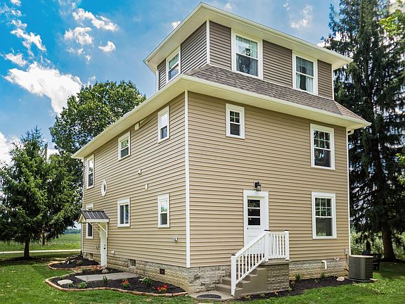 If you are looking for a recently finished farm home in the country yet close to town, come tour this home built in 1912, completely restored and has it All ~ Sits on 3 acres w/ pond & mature trees for privacy, you'll be hard-pressed to find this unique blend of an historic & new interior in Delaware: 9' ceilings w/ open floor plan ~ Original hardwood floors, 5-7''old-growth pine trim, solid 4-panel doors & hardware w/ reclaimed/repurposed wood thruout ~ New electric, plumbing and HVAC systems w/ 20 amp to all plugs ~ Front porch chngd to 4 season rm ~ New windows, siding & roof, SS app, granite counter-tops & 42'' cabinetry ~ 3 full bths w/ tile walls & floor-original 1916 Kohler claw tub master en-suite ~ Lg bdrms w/ walk-in closets,2nd bdrm gaming nook ~ 3rd floor bonus rm. 3 car garage