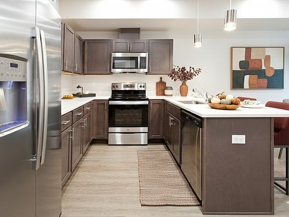 Inside, our meticulously crafted apartment homes set a new standard for upscale living. Featuring designer finishes, quartz countertops, custom cabinetry, GE stainless steel appliances, and central air conditioning, each residence is tailored for comfort and contemporary style. Open-concept layouts, luxury vinyl plank flooring, and large picture windows ensure your space is filled with light, warmth, and panoramic views of the surrounding mountainscape.