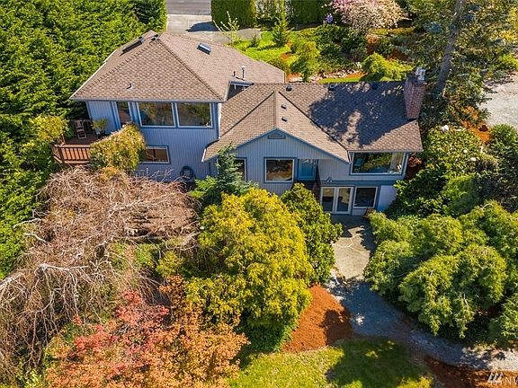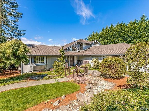 This lovely 4 bedroom, 2.75 bath, 3100 sq.ft home offers Privacy, Olympic/ Sound views on large corner lot with mature planting and trees. Large Master suite with deck, walk-in closet. Updated kitchen, gleaming hardwoods, entertainment deck, full light lower family room, Stream, pond & bridge. 700sq ft. Garage w/shop. Large bonus, guest/RV/boat parking. New lifetime roof, water, heater, furnace. Custom details and updates (new electrical, plumbing, insulation with 2500 sq ft addition in 1992)
