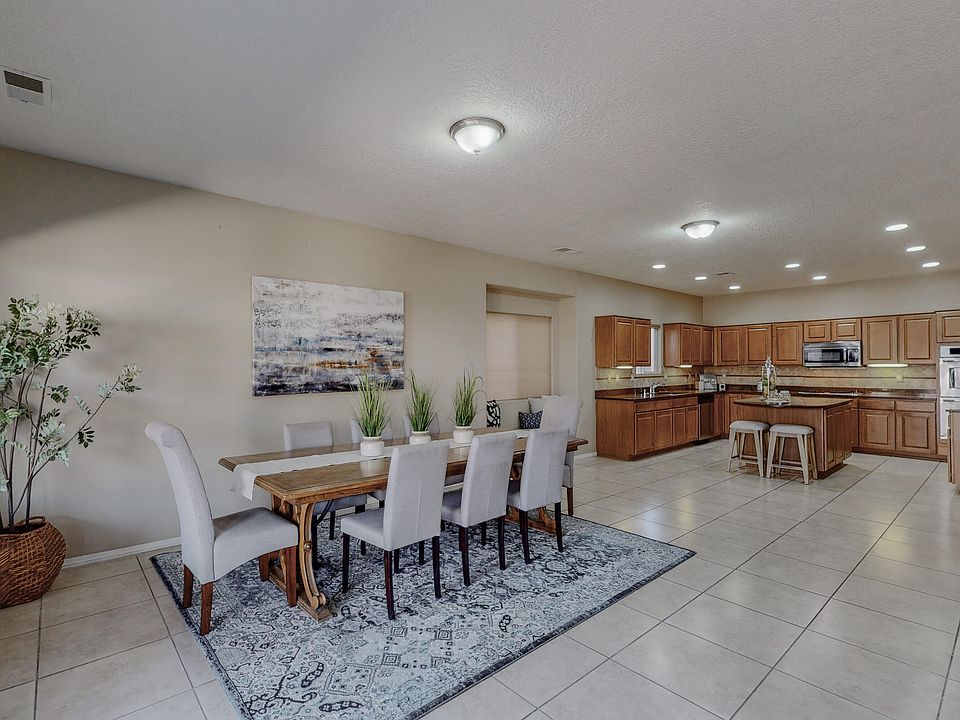 NEAR SANDIA LABS & BASE! LARGE LUXURY HOME under $599k!! 5 bd, 3 large living areas, built-in home-office space for 2. Gourmet Kitchen: Granite, SS appliances- TWO ovens, Gas range, Microwave, DW, Island w/seating, Open to Family room & Huge back patio. Refrig AC, Re-circ hot water! 1st level: 2 large living areas, FP, spacious dining nook +open dining room! Large neutral tile & neutral carpet. Backyard: huge covered patio +full open patio with pavers. Zeroscape front: rocks & trees w/bubblers= Easy Maintenance!! Grand owners' suite is private & well appointed: 2 sinks, jetted tub, separate shower, huge walk-in closet. Large Playroom upstairs +big laundry. Peaks of mountain views! Best loca near I-40, shops & restaurants! Great park nearby!