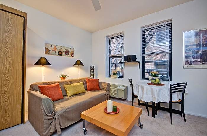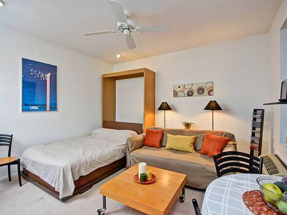Could make for a totally turn-key corporate rental! Comfortable, easy, affordable living in heart of the city. Smart layout with room to entertain, cook, eat, work, sleep. Good natural light. SUPER LOW fees. Recently updated kitchen & bath. Murphy bed. Washer & dryer in unit. Furniture, dishes & much more can convey. Pets welcome. Woodley metro=6/10 mile.