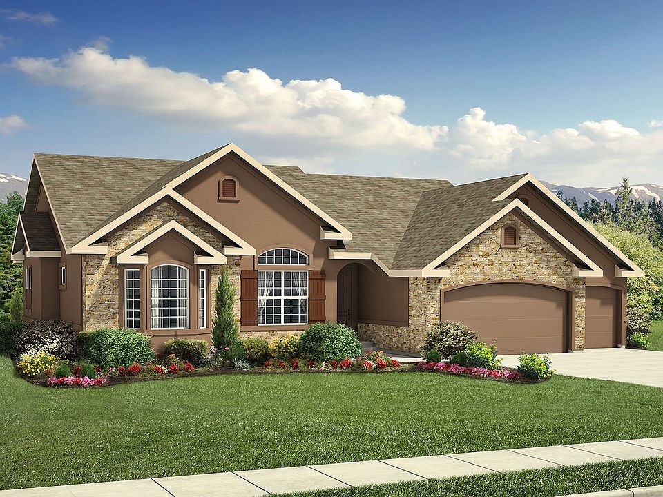 Ready in May. Stratford ranch plan with 3 car garage in Flying Horse Palermo. 4 bedroom, 4 bath home with study and finished basement. 5 pc. master bath. Barn door at master bath and study. *Design studio selections have not yet been finalized. Design upgrades pending. Includes air conditioning & two gas fireplaces. Two laundry rooms! Finished basement includes 1ft. taller ceilings, wet bar, plus 2 bedrooms, 2 bathrooms & recreation room. Includes expanded covered patio with gas line. Home features Amazon start package!