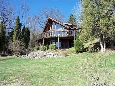 NOTE:30ft of waterfront across the road from this Outstanding quality LINDAL CEDAR HOME.(Neighbor has access to water) Home overlooks the lake, set above the water with commanding views and wonderful wooded privacy. LARGE Loft area is perfect for guest bedroom (with best lake view in the home). LOWER LEVEL features a full bath as well as the capability to be additional bedroom. Wrap-around decks and screened room, makes this year 'round home the perfect LAKE HOME with all the city features. (Cable, Gas Public Water and large 2-car garage. 7 miles from Skaneateles and Marcellus.