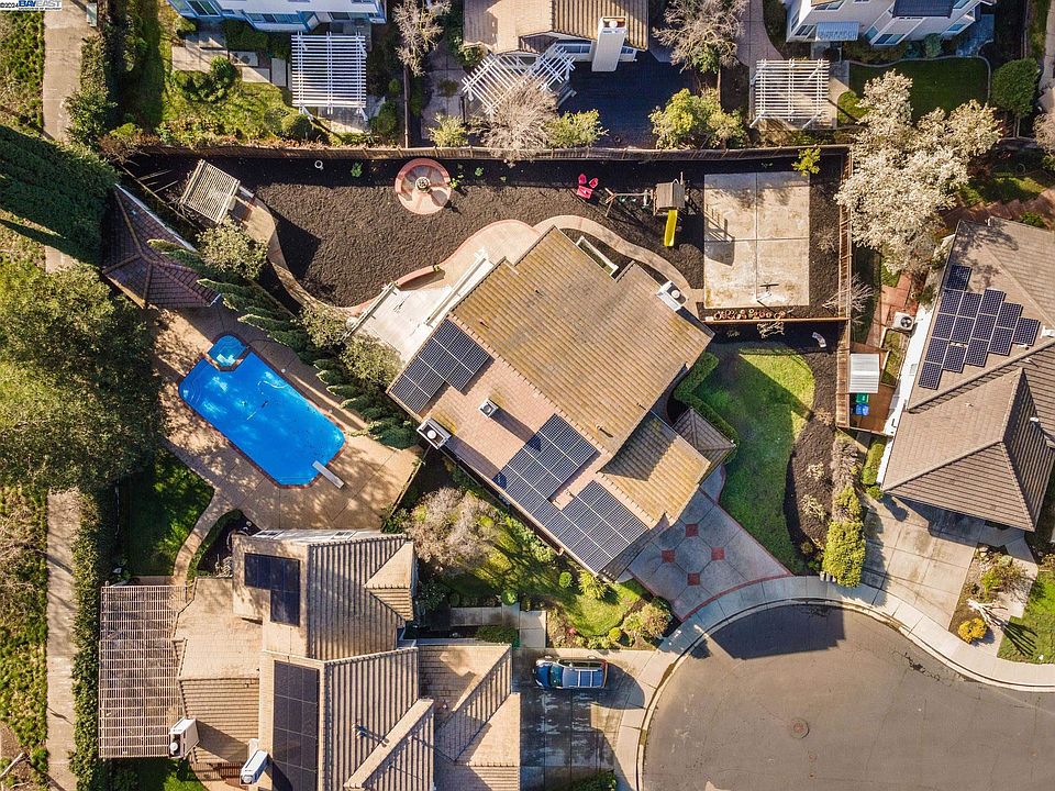Welcome to 1844 Palmer Drive, a stunning residence nestled in a coveted court location in Pleasanton, CA. This elegant 5-bedroom, 3-bathroom home boasts a generous 3369 square feet of living space and is situated on a spacious 10511 square foot lot. Upon entering, you are greeted by the seamless blend of modern comfort and timeless sophistication. The interior is adorned with new carpet, refinished hardwood floors, and freshly painted walls, exuding an air of refined luxury. Both the living and family rooms have extensive woodwork surrounding the fireplace and cornices above the windows and front door. A primary bedroom and a full bathroom on the lower-level offer convenience and versatility. The residence is equipped with two heating and air systems, ensuring optimal comfort throughout the year. The presence of house solar further enhances energy efficiency, aligning with sustainable living principles. The home is adorned with sought-after amenities, including ceiling fans, central AC,3 fireplaces, and forced air heating. The laundry room features durable LVP flooring, while the 3 car, attached garage provides parking and storage space. Outside, the expansive lot beckons with a wooden play structure, a sport court, and a basketball hoop, creating an ideal setting.