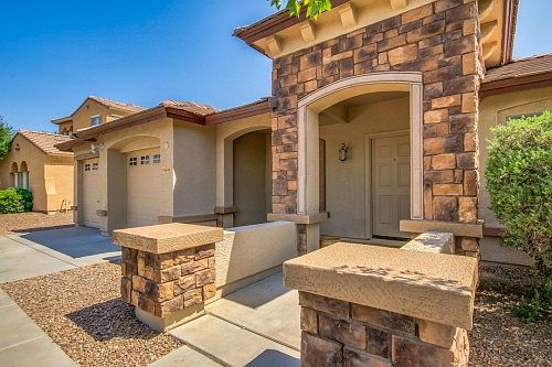 Complete info: http://18444walnut.IsNow4Sale.com - Welcome to this spectacular 3 bed, 2 bath & den property in the sought-after Sossaman Estates in Queen Creek. Fabulous stone accented exterior with covered porch leads you to beautiful interior featuring spacious living room, formal dining, family room with fireplace and media niche, and fabulous kitchen boasting plenty of cabinets and counter space, large island, stainless steel appliances, gas range, breakfast bar, built-in study niche and pantry. The spacious master bedroom offers immaculate master bath with double sinks, separate tub and shower, and walk-in closet. The laundry room is large enough to hold extra refrigerator and more storage. The backyard has cozy covered patio, grassy area to play in and space for pool. Don't wait. Schedule your showing today. Exterior just painted.