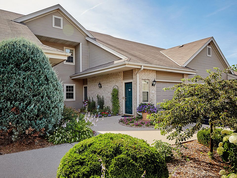 Immediate occupancy is available in this first floor Brookfield condo! Spacious living room/dining room combo includes a charming artificial fireplace to add to the ambiance of the space. The primary bedroom includes a large walk-in closet and en suite bath. The kitchen is open to the living/dining room with a breakfast bar and includes stove, refrigerator and dishwasher. The private entrance is off a beautifully landscaped courtyard, and all windows face common green space. Enjoy the beautiful weather on the private patio, and the convenience of an attached garage and in-unit laundry with full size machines. Plenty of large closets for your storage needs. Pleasant community close to freeway and shopping.