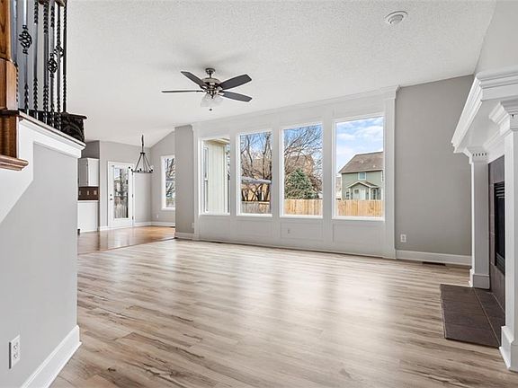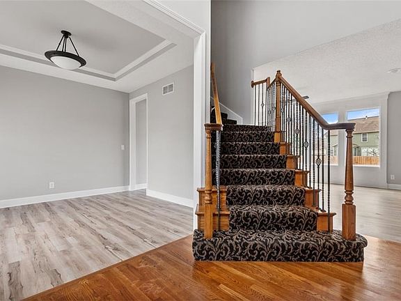 This beautifully refreshed Olathe home is one you won't want to miss! Freshly painted exterior. Extended front porch, large 3-car garage with built-in shelving, and full-width 3-car driveway. Hardscaped backyard with ambient lit, bi-level stamped patio, gas fire table, and pergola. The professionally painted interior, includes freshly painted ceilings, woodwork, walls, and cabinetry. Updated KitchenAid Convection Oven/Electric Range, Dishwasher, and Microwave. Great Room and Dining Room LVP flooring were added a few years ago. New carpet on basement stairs and in basement flex-room, perfect office or guest space. Engineered wood floors on the second level, in all bedrooms. The bedroom over the garage has incredible vaulted ceilings, a recessed area perfect for a play area, or desk, also includes a walk-in closet. Spacious Primary Suite with vaulted ceiling. The primary bath includes a double vanity, corner jetted tub, shower with bench, private toilet area, and built-in mirror outside of the walk-in closet. Measurements, dimensions, and sqft are estimated.