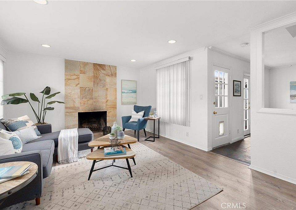 a sleek and clean first impression. The living room boasts newer laminate flooring