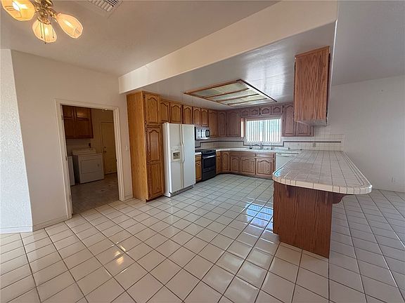 - Breakfast Bar, Ceiling Fan(s), Kitchen Island, Open Floorplan, Tile Countertop, Tile Counters