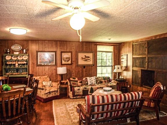 Waterfront Living At It's Best! Spacious Rustic Home! Huge Family Room w/fireplace and wet bar, Master Bedroom w/large cedar lined closet, 2 full baths, den off kitchen & sun room w/great waterfront view, hardwood & tile floors, 2 central heat & air units, 2 hot water heaters, 3 +/- Acres with beautiful oak trees, Rain Bird Sprinkler System, nice detached outbuilding/garage plus storage building, remote entrance gate, enjoy all types of wildlife, deer, duck, and small game. (All furniture and appliances included.)