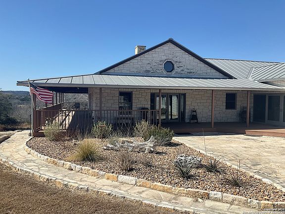 Have a look at this beautiful 33.12 acre ranch with a 5 bedroom 3 bathroom bi-level home, a guest cottage on the creek, and a 3360 square foot steel out building/workshop. The property is situated approximately 9 miles North of Sisterdale and approx 15 miles south of Luckenbach, TX with amazing views. The main home boasts 5 bedrooms and 3 bathrooms. The kitchen is newly remodeled. Stainless steel appliances enhance the quartzite countertops and back splash. Wrap around porches and large windows provide great access to the unobstructed views for miles! The home boasts 2 fireplaces with one on each level, plus a flagstone fire pit with seating area just outside the lower level of the home. The primary bedroom has it's own private balcony. A glassed sunroom also includes its own deck There is an attached 3 bay garage and workshop area. There is approximately 500' of frontage along FM 1376, which includes a secured service gate. The property is fenced on all sides. An electric gate at entrance to the property, opens onto the paved drive which runs up from the front of the property to the house, which affords spectacular views. The guest cottage is accessed by its own road and also by a flagstone path leading down from the main house. The one room (16X29') cottage, situated by Wenzel Creek which runs through the property, has its own parking area with a bridge/walkway connecting the two. The cottage includes a kitchenette with refrigerator, washer and dryer, and bathroom with shower. The large steel out building is on a slab with 4 exterior automatic roll-up doors and also includes a car lift. A well supplies water to the main home and cottage, including the lawn sprinkler system. The new commercial grade septic system was installed within the last year. Sellers have a survey that is less than 2 years old. There is a Wildlife tax exemption currently in place. Sellers will entertain leaving home and cottage furnished, with a few exceptions.