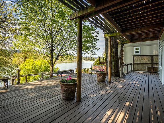This private retreat is perched above the banks of the Willamette River, with over 50 feet of river frontage and gorgeous views toward Cedar Island Park from both the home and decks. Take advantage of all the summer activities like paddle boarding, fishing, and kayaking right out your front door. The 2,2264-square-foot layout lives on two levels and consists of three bedrooms (two with river views), two full bathrooms, an office, and a laundry room. Perfect for entertaining, the open-concept living and dining rooms open up to the multi-tiered decks from the glass French doors. Prepare meals in the chef's kitchen, complete with a cooking island/eating bar, wine storage, built-in oven, and ample cabinet space. Escape upstairs to the primary with double closets and large sliding door access to the upper deck. Take your pick of multiple outdoor spaces to entertain, both covered and uncovered, or stroll through the park setting with mature landscaping and garden beds towards the river and enjoy the vast lush yard. Ideal for toys and tools, there is a shed on the stroll down towards the river for storage that is convenient. Next to the main house is a workshop, and detached is a two-car garage with additional storage space. Do not miss this river retreat, perched in an ideal location close to grocery stores and restaurants yet tucked in enough for privacy.
