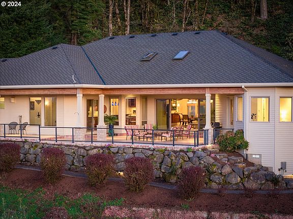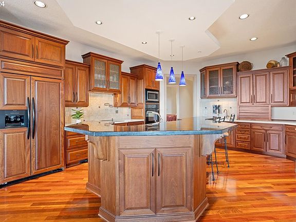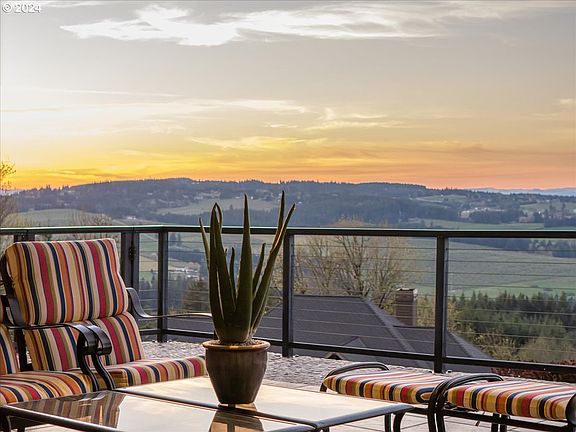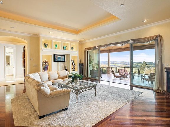 This custom-built, single-level home sits on 2.04 private acres at the top of Parrett Mountain View Estates, a highly sought-after gated community in Sherwood, and claims some of the best panoramic views in the valley. New landscape lighting borders the drive up to the expansive property that is both impeccably landscaped and heavily wooded for ultimate privacy. The pillared entry leads to the main living space that features 10 ft lighted tray ceilings, Brazilian teak hardwood floors, and 16 ft sliding glass doors that lead to the nearly 1700-square-foot cedar-covered and tiled terrace that highlights valley, city, and vineyard views, as well as picturesque views of St. Helens, Mt. Adams, and Mt. Rainier. Secluded on one side of the home sits the expansive primary bedroom with two walk-in closets, French doors to the oversized terrace, and the spa-like primary bath with a secret door that leads to the private home office that features gorgeous wainscoting and built-in bookshelves. The oversized gourmet kitchen has extensive Sapele mahogany cabinetry, as well as a large slab granite island, marble backsplash, and Corian counters. The breakfast nook and great room with a gas fireplace overlook the massive terrace and feature breathtaking panoramic views. Two additional oversized bedrooms with ensuites and walk-in closets, a laundry room, and a second pantry are all connected by the hallway leading to the oversized two-car garage with brand-new epoxy flooring, a workbench with extra storage, and a utility sink. The large theater room completes the home and features a 9 ft screen, surround sound, and a wet bar. Must see to appreciate how special this one is!