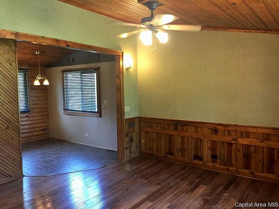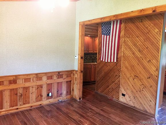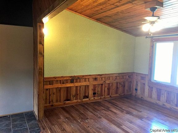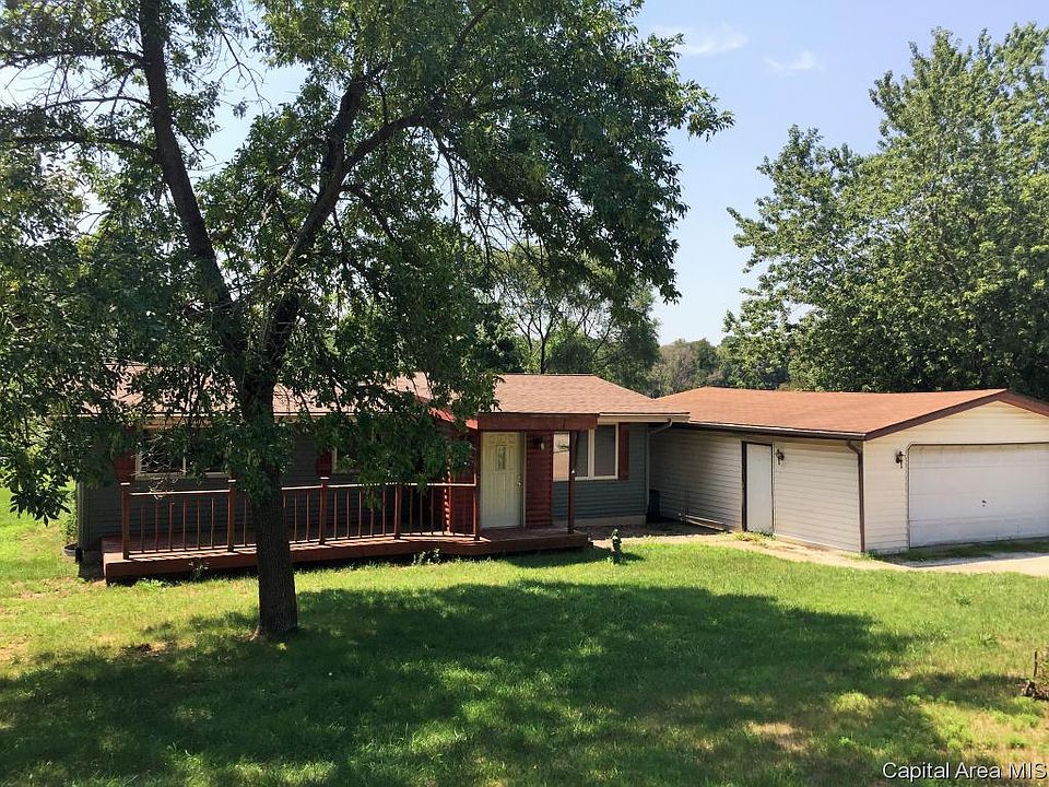 Rustic Chic Hideaway!! 2 bed/ 1 Ba settled on a HUGE lot outside of Havana. Remodeled over the past 17 yrs of two owners. House has hand scraped hardwood floors, pine ceilings, pine walls, log walls & custom built ins! Kitchen boasts beautiful cabinets, glass block back splash, pantry & stainless appliances! Lg Master has barn style closet doors & character galore! 2nd Bedrm has vaulted ceilings and overlooks spacious backyard. Lower Level waiting to be finished~ some new flooring & drywall already hung. Deck & porch off the Kit for entertaining! Detached 2.5 car garage & Shed.