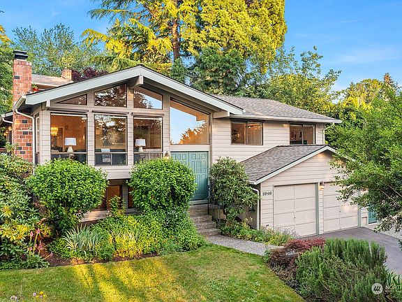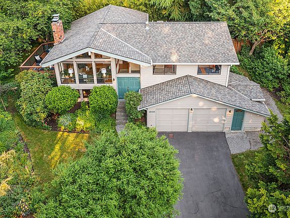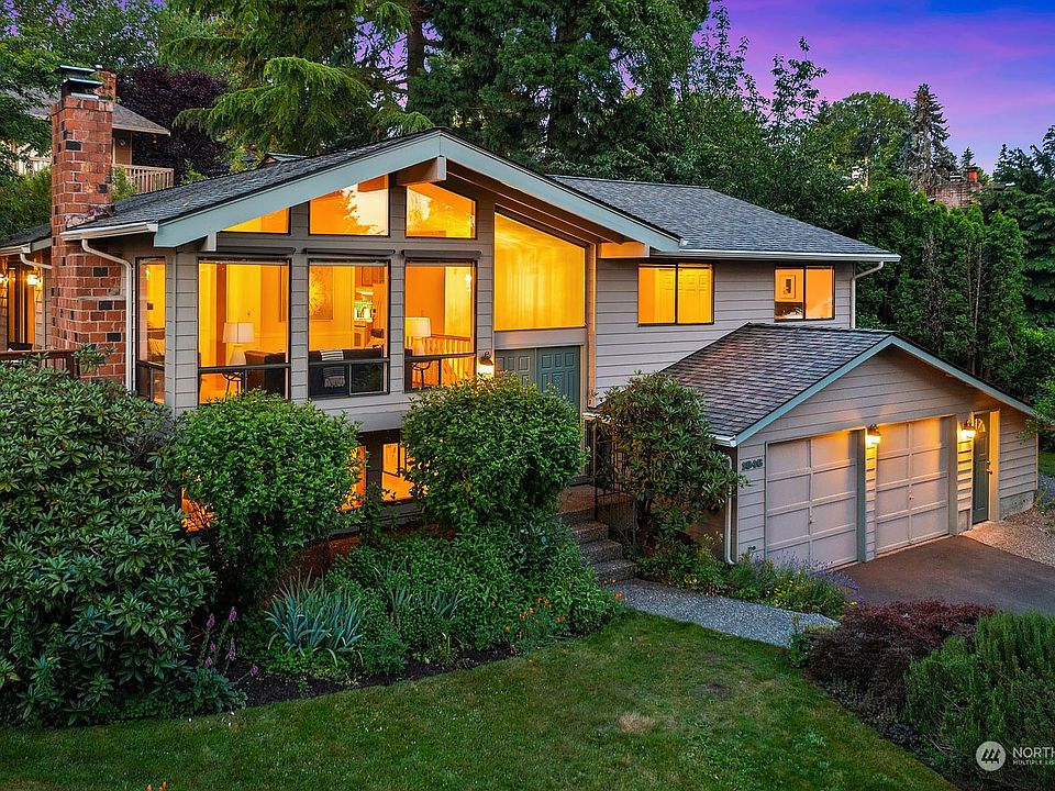 Privately tucked away gem perched high above the end of a quiet street in a majestic oasis wrapped in lush gardens with top of the world views of Juanita Bay & secluded treetops, this East of Market treasure is a rare find! Modern mid-entry with open rail staircase, soaring wall-to-wall view windows & vaulted open-beam ceilings throughout. Formal living & dining rooms open to grand entertainment view deck. Spacious custom kitchen with impressive eating space addition. Primary suite with luxurious spa shower, skylights & walk-in closet. Huge family room with 2nd fireplace & wet bar. Bamboo hardwoods, wainscoting, upgraded millwork, fresh paint & new carpets. Large garage with shop/storage. Short stroll to schools, parks & Downtown Kirkland!