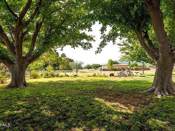 Built in 1966 by George Dodge, this charming single-level home sits on 1.41 fully fenced acres at the end of a private road, shaded by four majestic Mulberry trees. There is a sprinkler system present in both the front pasture and the backyard. Enjoy sweeping views of Mingus Mountain, a spacious pasture, chicken coop, and barn, perfect for a rural lifestyle. Inside, a striking rock fireplace with pellet stove insert warms the living room. The newer, modern lighting and ceiling fans throughout this home are a welcome enhancement. The kitchen features granite countertops and electric appliances, while bedrooms offer built-in dressers and shelves. Freshly painted in 2024, this inviting property blends comfort, function, and country charm.