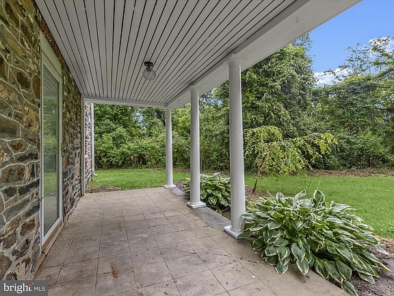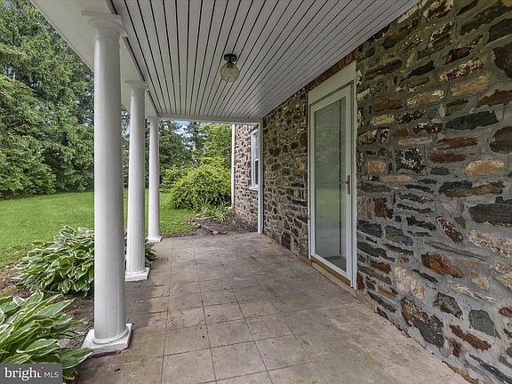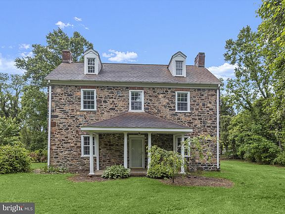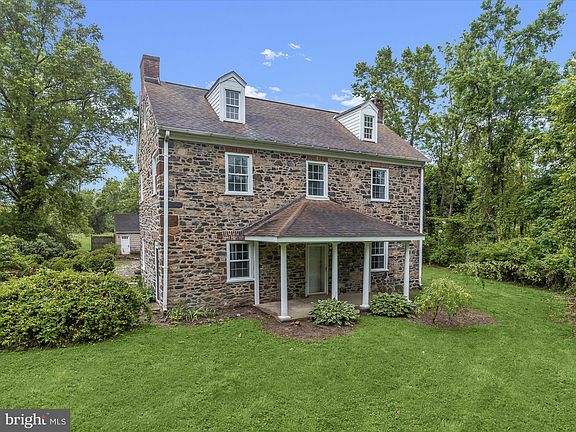 Surrounded by gardens, and large lawns fringed by trees, this stately stone house presides over 1.5 acres of history and beauty. Enter through a covered portico with stately white columns that will welcome friends and family inside to a place of charm and antiquity. Step back in time while you enjoy the present with freshly painted large rooms, refreshed solid wood floors, upgraded kitchen, laundry, bathrooms, and lighting. The main living spaces include living and dining formals, a library with built-in bookcases, and an eat-in kitchen. An open stair and gracious upper landing is central to four generous bedrooms and a hall bath. Explore outdoor living spaces from access doors in the Living room, Library, Dining room and Kitchen. A brick paver walk meanders past garden beds to a detached 2-car garage, and a rolling green field beyond. Come home to history, charm, and gracious right-sized living. (Note: Fireplaces are sealed and images are shown with virtual fire)