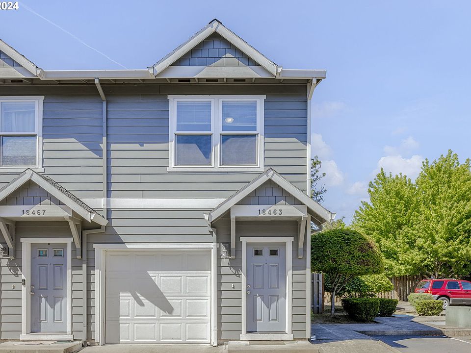 OPEN SAT 10/19 12-2! End unit 2-level condo with brand new floors, high ceilings, & two ensuite bedrooms! Great room main level is open and spacious; kitchen comes with stainless steel appliances and bar counter seating. Slider to fully fenced back patio with yard and planter boxes is perfect for the garden enthusiast. Upstairs, both bedrooms are vaulted and come with their own private bathrooms. Laundry room also on upper for added convenience; half bath on the main for guests. Plenty of windows allow for natural lighting throughout. Garage comes with built-in shelf for storage. Ample visitor parking available throughout complex including right outside unit! Home is move-in ready with all appliances included. Sewer, water, & trash all included in the HOA. Convenient location near Tualatin Hills Nature Park and quick access to Costco, Nike, and Intel!