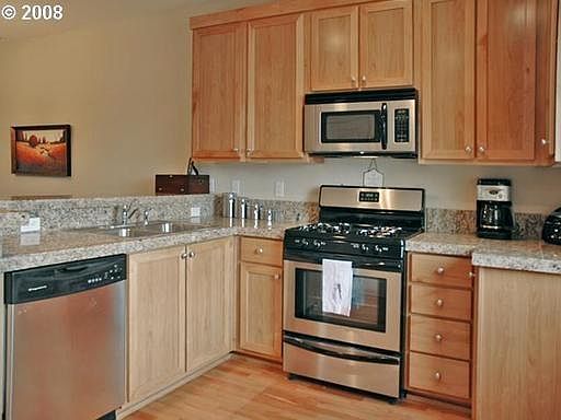 Townhome style Condo nestled in private community at 185th/Baseline. Close to transportation, shopping and freeways. Main level has living room with gas fireplace, kitchen with all appliances & hardwood flooring and eating bar open to dining area and half bath. Upper level has two bedrooms and two bathrooms, vaulted ceilings, wall to wall carpeting and washer/dryer combo. Lower level has single car garage, storage and large 3rd bedroom or bonus room with private entrance. Water and sewer are flat rate 60/mo!! Drive by and call today to get more information. Photos are of similar unit Directions: SE corner of 185th and Baseline Heating: For-Air Gas Sq Ft: 1550 Laundry: In place, not warranted Utilities Paid: HOA/exterior maintenance & grounds Pets? Negotiable Parking: 1 car garage Elementary School: Beaver Acres Middle School: Five Oaks High School: Aloha