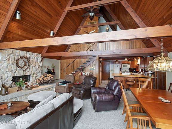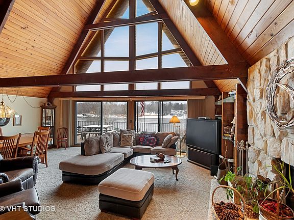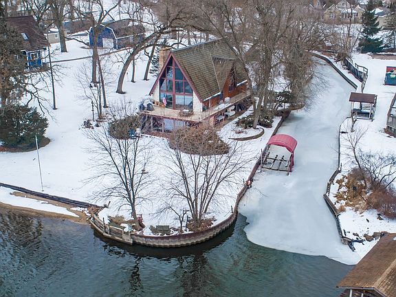 One of the most unique and iconic homes on the Lower Fox River! Come experience a lifestyle enjoyed by few. Year round recreation inside and out with plenty of room for all of your toys. A mature wooded home site situated on over a half acre with 300+ ft. of Fox River and channel frontage, an expansive driveway, an over-sized 2 car detached garage, tons of yard space and a sandy beach. This A-frame style home was built with entertaining in mind featuring an in-ground indoor swimming pool in the lower level complete with its own fireplace, views of the river and full wet bar & rec area. Year-round ever changing views from the living room boasting a wall of windows, a planked cathedral ceiling with exposed beams and a stone fireplace. A kitchen that opens to the living area with a breakfast bar. 2 bedrooms and full bathroom on main level. Master bedroom, full bathroom & loft area on 2nd level. Large wraparound patio that is perfecting for entertaining guests or watching the activity on the water. Park your boats/wave runners on the channel to keep your views unobstructed. Come with your decorating ideas and make this place your own! Bring the boat, fishing poles, snowmobiles and ice skates! Close proximity to the Cary Country Club, Downtown Cary, Metra train station and Rt. 14. Highly regarded Cary schools!