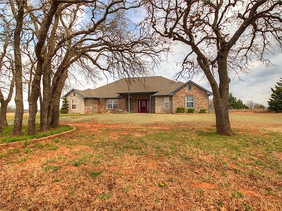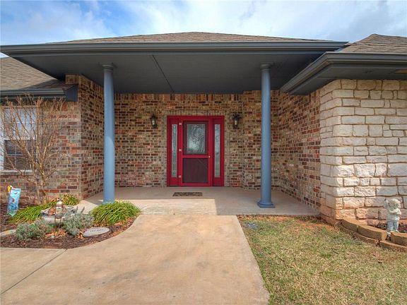 Your new home in Blanchard's desired Oakmont addition! Room for everyone in this large 4 bedroom, 3 bath home on over an acre. Enter into huge living room with gas fireplace, crown molding, and wood inset ceiling detail. Kitchen features walk in pantry, built in china cabinet, new gas range with dual oven, new appliances and counter tops. Recently updated with new wood-look tile floors throughout the main living areas make for a beautiful open floor plan. Large master suite with his and her walk in closets, dual vanities, whirlpool tub and walk in shower. Office/study features built in desk and bookcase. Split floor plan with 3 other large bedrooms, one with private bath, and two sharing jack and jill bath with dual vanities. Oversized laundry room with wash sink. Above ground safe room in garage. Fenced back yard. Alarm system. Older above ground pool can stay or will remove.
