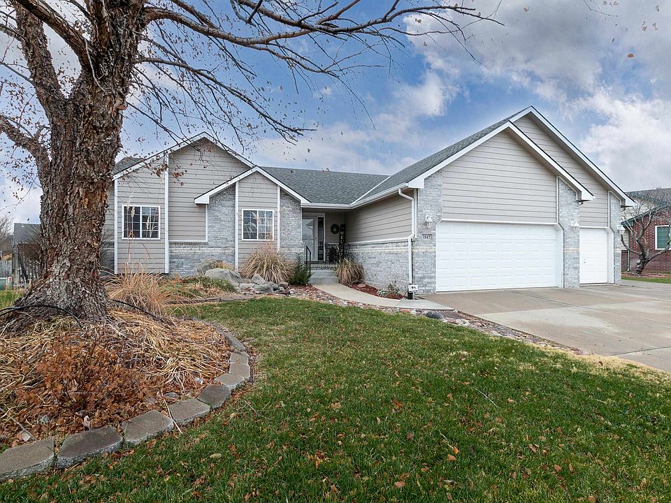 MULTIPLE OFFERS RECEIVED - BEST & FINAL DUE BY SATURDAY, DECEMBER 10TH, AT 5:00 PM. Welcome home to this updated ranch in the Lark Addition and Goddard School District. Situated on a cul-de-sac lot with the neighborhood playground and lake adjacent to the property. Enjoy your covered deck and watching evening sunsets over the water. Fenced yard, sprinkler system, extended concrete in front as well as behind the fence gate, and overhead garage door that opens to the back patio! The main floor features a vaulted ceiling, fireplace, with hardwood flooring throughout the living room, dining room, and kitchen. The updated kitchen has granite countertops and an island. Main floor master suite with tub/ shower and two sinks, walk in closet. Full finished walkout basement with huge family room and 4th bedroom. Large storage room. Laundry both on main floor and in basement, basement laundry is set up for a gas dryer. NO Specials!!!!!!!