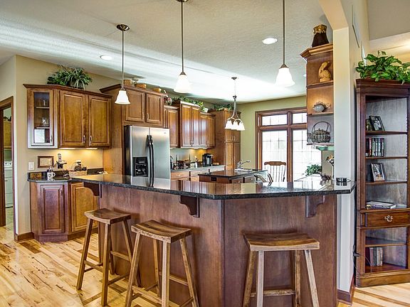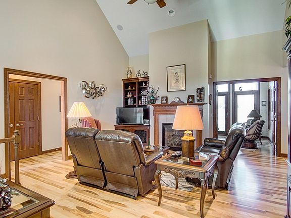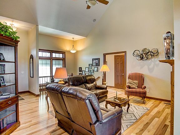 An exceptional custom built home by the reputable T.L. Jackson. This stunning ranch greets you with attractive curb appeal and landscaping leading you to the front door. Welcoming from the foyer with incredible hardwood floors throughout the open concept living room, dining, kitchen and nearby sun room. Custom built ins and a fireplace showcased in the main living room with vaulted ceilings and overlooked by the spacious kitchen with granite counter tops and ample cabinetry plus an island with prep sink and garbage disposal. A split floor plan offers privacy for the master suite with double sink vanity in the bath plus a jetted tub and tile walk-in shower! Across the home, you'll find two additional bedrooms with Jack-n-Jill bath. Main floor laundry and nearby powder room, conveniently located off the garage/workshop connects to the second garage space. A full basement offers you the potential for additional living space. Ready for your full design and plumbed for a bath and still have plenty of storage space. Enjoy the backyard with a stamped concrete patio overlooking the Stonehenge Golf Course and incredible sunsets!