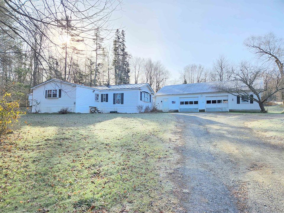 Great location on a paved road surrounded by a large parcel. This property has a large kitchen with island, 2 bedroom, 2 full baths. Deck, shed, mudroom, breezeway to a 2 car attached large garage with storage above. 1.38 +/- acre of sloping land with a local hillside view. Only 7.3 miles to I-91 and the town of Bradford with all its amenities. Drug store, lumber company, dining, banks, golf course and the list goes on. 2 miles from E. Corinth General Store. Great vacation get-a-way or first time home buyers. Remove the manufactured home and build your dream house. Furnishings included. Being sold "AS IS". Cash only. No slab. Come take a look!