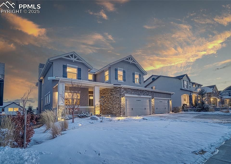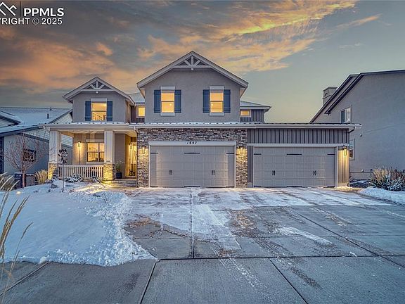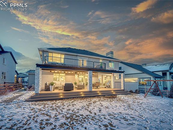 Spectacular 2-story with Custom Updates in Flying Horse!  Gorgeous curb appeal featuring stucco & stone exterior, cottage shutters, covered front porch, and new landscape lighting.  Open floor plan w/ high ceilings, oversized windows for natural light, LVP flooring, executive office w/ french doors and custom built-in book shelves, large great room w/ stone fireplace, wood mantle, & all new modern light fixtures.  Gourmet kitchen features quartz counters, double combo oven, gas range w/ hood, craftsman wood cabinets w/ modern hardware, designer tile backsplash, huge walk in pantry, large island, & farm sink.  MASSIVE custom exterior remodel project featuring new partially covered back deck w/ composite wood, built-in heaters, shiplap wood ceiling, gas lines, stone pillars, grilling station area & hot tub area.  Upper level features huge master suite w/ high ceilings and incredible NEW upper level private balcony w/ unobstructed mountain views.  Master bath is a spa  w/ large walk in shower, three shower heads, free standing modern tub, double vanity w/ quartz counters, framed mirror, modern light fixtures, & huge walk in closet.  Large upper level loft.  Upper level laundry room w/ window, sink, and built in cabinets. Basement features 9 ft ceilings, state of the art Dolby ATMOS Home Theater system, and custom wet bar equipped with beverage fridge, sink, quartz counters, & modern pendants. In ceiling speakers in kitchen, great Room, office, primary Bath and deck.  Rare 4-car garage w/ oversized doors and EV Charger.  Dual zone climate control. Culdesac lot.  Mature trees for privacy.  Close to award winning Flying Horse clubhouse.  Uncommon pride of ownership!