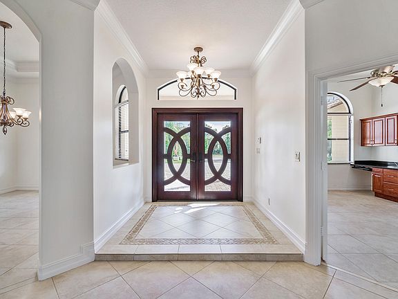Arrive home with pride to your custom built 2005 Mediterranean designed home with 4,111 sq ft of living space featuring 4 bedrooms, 3 baths, CBS construction & heated pool with waterfall located on the 1st hole of Jonathan's Landing Old Trail Golf Club in Jupiter Florida. Nestled on 1 acre with magnificent Silver Bismarck Palms and space for vegetable garden. Immaculate & meticulously maintained this home features high impact windows and doors, new artisanal wood and glass front doors, vaulted tray & sloped ceilings, fireplace, 20'' tile, new carpeting, interior freshly painted, abundance of space for entertaining, crown molding, large chef's kitchen with cherry cabinets, granite counters, walk in pantry and center island, The 3.5 garage has 2,456 sq ft of storage space for all your need