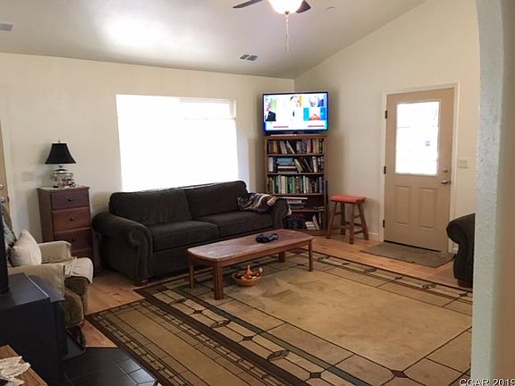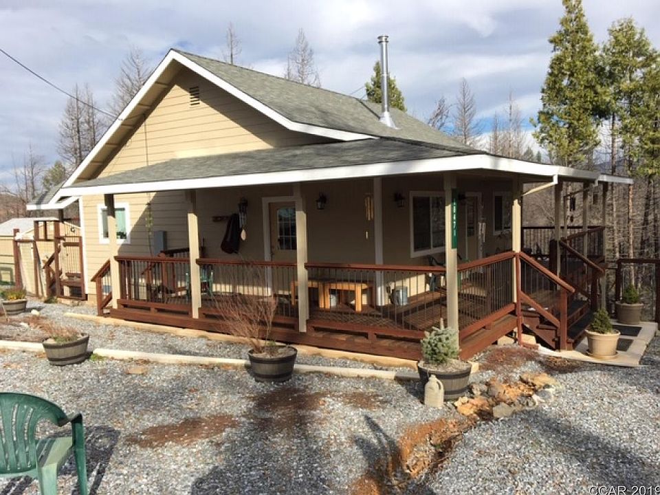 If you would like to get back to a quieter, simpler lifestyle, consider this 2 Bd, 1 Ba newer home on 6 acres with a fenced yard. The siding is concrete and there is a covered porch on 2 sides of the house for your rocking chairs.There is a garden area and a basement with dirt floors and with lots of shelves. Also outside are 2 insulated sheds. Inside is an open floor plan with custom cabinets and a eating bar in the kitchen and a woodstove in the living room.Their other home burned in the Butte fire and now they have a lovely new home.This is a house for people who enjoy living with nature.