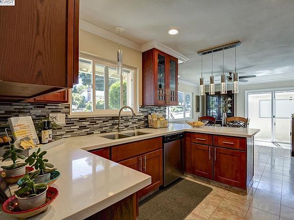 Outstanding remodeled one-story on peaceful court walking disrance to Lake Chabot. Elevated corner lot with lots of curb appeal, detached deluxe garage, beautiful landscaping, play areas, dog run & poss. side access. Step into the bright contemporary living room w/cozy fireplace & gleaming hardwood floors. Stunning modern kitchen w/quartz counters, stainless appliances, pendant lights & convenient nook for homework/computer. Both baths redone w/square sinks, chrome fixtures, a slab quartz shower in master. Inside laundry room, newer windows, roof, paint - truly move-in condition. The friendly neighborhood speaks for itself with everyone out walking, block parties, close to great schools, market, & minutes from BART & fwy.