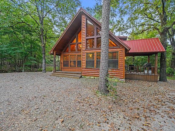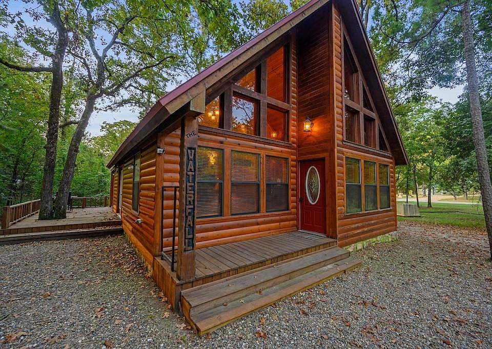 Waterfall cabin has an open concept design that boasts vaulted ceilings and wide windows along the front of the home. A double sided gas fireplace is a feature of the living room and bedroom. There is a large jacuzzi tub in the bathroom that is perfect for relaxing. Upstairs in the loft is a queen size sleeper sofa. Outside, the cabin offers a back deck, a fire pit in the yard, and a hot tub on the deck. The cabin is located on the South entrance of 259A and close to Beavers Bend State Park. Cabin has fantastic rental history! Call today for a showing!