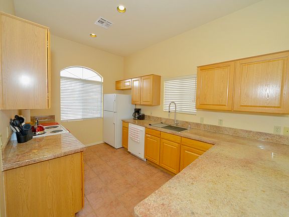 Very private town house with a park like setting. Morning coffee sitting on the private patio opening up to a huge arroyo and evening drinks on the quaint patio watching the mountains turn pink. This fully furnished town home with 10 ' ceilings is PERFECT for a snow bird lifestyle. It has been meticulous cared for with fresh paint, some upgraded lighting, and epoxy kitchen counter tops. They are as durable as stone, super easy to care for and do not allow any bacteria to set it. Huge master bedroom, large walk in closet with stackable washer dryer right there. One side of the home is a separate entrance 1 bed 1 bath with a kitchenette- perfect to rent out or for family visits.