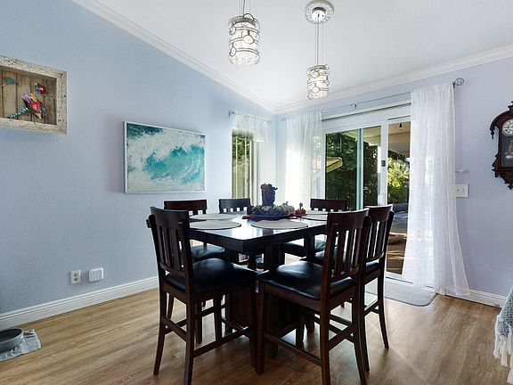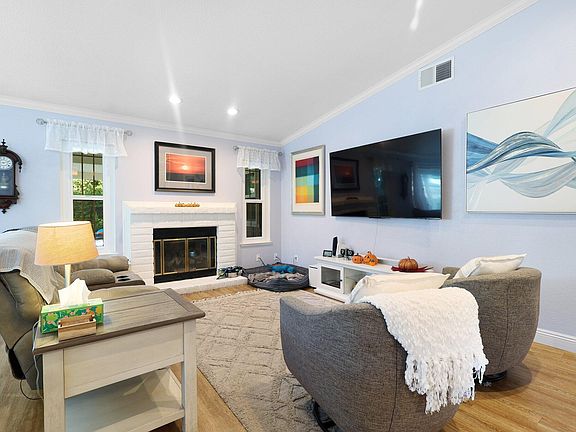 This cute 3-bedroom, 2-bathroom with a POOL is conveniently located in a peaceful cul-de-sac. Step inside to discover a cozy yet bright living room featuring a gas fireplace and built-in bookcase. The beautifully remodeled kitchen shines with elegant granite countertops, making meal prep a joy. You'll love the modern look of the newer LVP flooring that flows throughout the home, complemented by a tastefully remodeled guest bathroom. Enjoy outdoor living on the covered back porch, take a dip in the heated pool, and eat fruit from the lemon and orange trees. With energy efficiency in mind, this home features solar panels. Double-pane windows were installed in 2024. Bonuses include RV parking, a newer roof, a newer HVAC system, and a newer garage door.